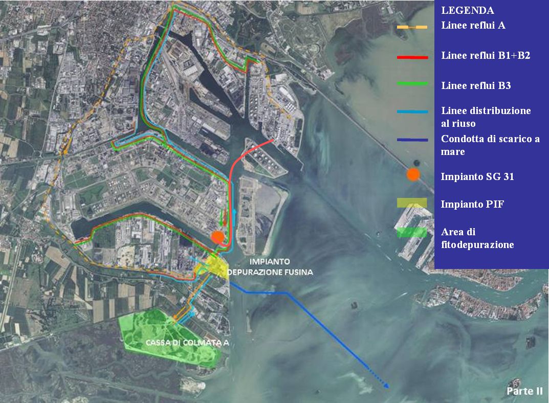 - la bonifica dei siti inquinati di Porto Marghera, costituendo una piattaforma polifunzionale per gli interventi di riqualificazione ambientale nell’ambito del Master Plan, dato che rappresenta l’elemento chiave per il ciclo delle acque, in particolare per il trattamento delle acque drenate a tergo dei marginamenti e derivanti dagli interventi di bonifica della falda inquinata;