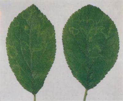 Le foglie della vegetazione primaverile presentano linee, piccole areole o tacche anuliformi di colore verde chiaro, per lo piů adiacenti o localizzate su una nervatura secondaria. Talvolta, in estate, i margini delle aree clorotiche assumono una colorazione rossastra.