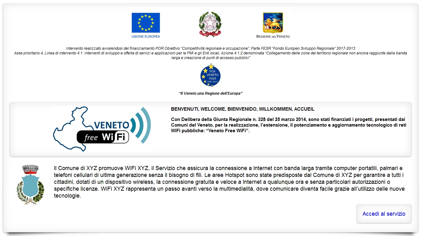 L’Avviso pubblico per il finanziamento di progetti presentati dai comuni per la realizzazione, estensione, potenziamento e aggiornamento di reti WiFi pubbliche all’art. 10 punto 8 prevede, tra gli obblighi dei beneficiari, “la predisposizione di una pagina di benvenuto” per l’accesso alla rete finanziata con il progetto “Veneto Free WiFi”.