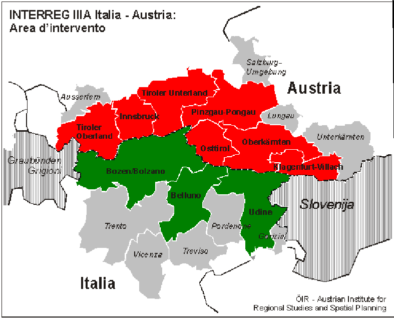 Area d'interventoCome previsto dalla Comunicazione della Commissione delle Comunità europee (2000/C 143/08) riguardante l'iniziativa comunitaria INTERREG III, i Laender austriaci Carinzia, Salisburgo, Tirolo e in Italia la Regione autonoma del Friuli Venezia-Giulia, la Regione del Veneto e la Provincia autonoma di Bolzano-Alto Adige hanno elaborato il Programma Italia-Austria. L'area programma corrisponde alle seguenti regioni NUTS III: