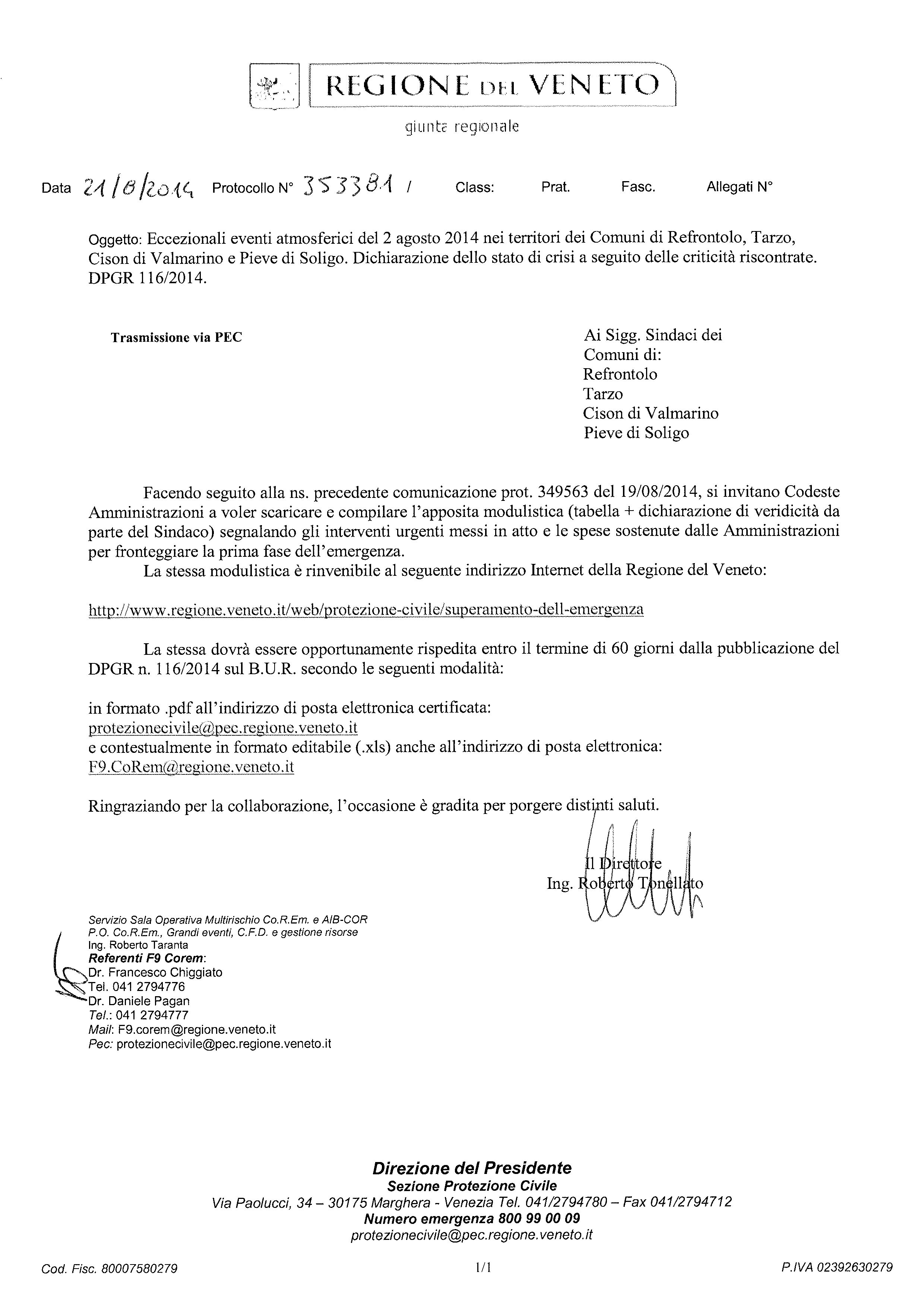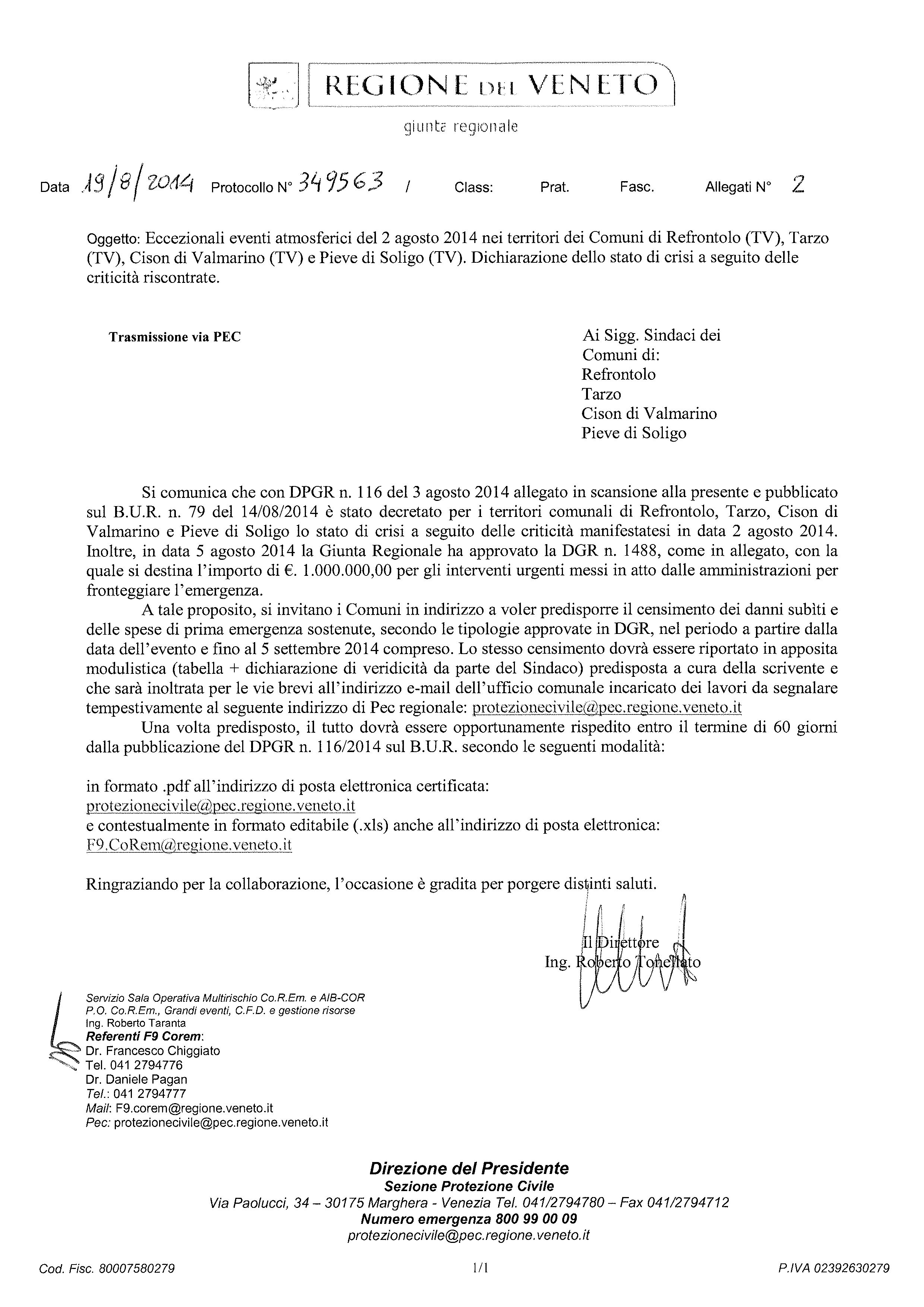 A seguito delle eccezionali precipitazioni del 2 agosto 2014, con il DPGR n. 116 del 3 agosto 2014 è stato dichiarato lo “Stato di crisi” ai sensi della L.R. n. 11/01 per i territori comunali di Refrontolo, Tarzo, Cison di Valmarino e Pieve di Soligo (tutti Comuni in provincia di Treviso). Inoltre, in data 5 agosto 2014 la Giunta Regionale ha approvato la DGR n. 1488, con la quale si destina l’importo di €. 1.000.000,00 per gli interventi urgenti messi in atto dalle amministrazioni per fronteggiare l’emergenza. Le amministrazioni coinvolte sono state informate delle iniziative intraprese dalla Regione con nota prot. n. 349563 del 19/08/2014.
