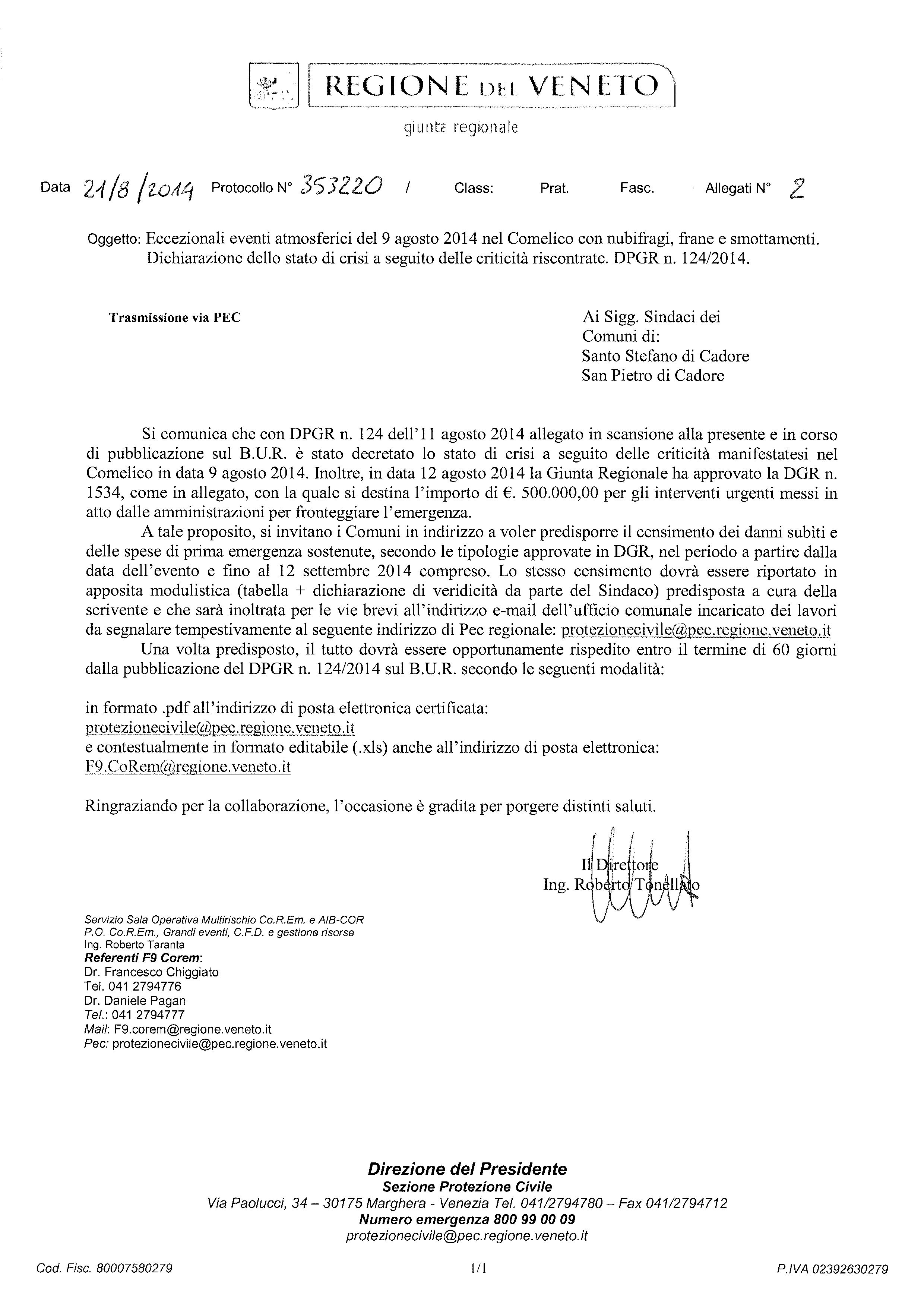 A seguito delle eccezionali precipitazioni del 9 agosto 2014, con il DPGR n. 124 del 11 agosto 2014 è stato dichiarato lo “Stato di crisi” ai sensi della L.R. n. 11/01 per i territori comunali di Stefano di Cadore e San Pietro di Cadore, entrambi in provincia di Belluno. Inoltre, in data 12 agosto 2014 la Giunta Regionale ha approvato la DGR n. 1534, con la quale si destina l’importo di €. 500.000,00 per gli interventi urgenti messi in atto dalle amministrazioni per fronteggiare l’emergenza. Le amministrazioni coinvolte sono state informate delle iniziative intraprese dalla Regione con nota prot. n. 35220 del 21/08/2014.